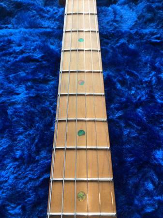 Artist Edition with matching painted headstock, baked maple neck, anodized brushed aluminum pickguard and rear trem cover, abalone dot fret markers.